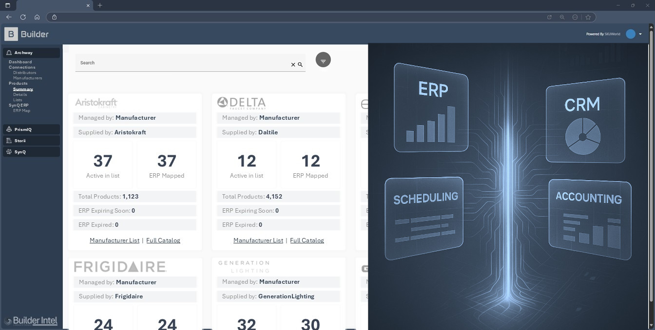 Archway seamlessly integrates with SynQ, Builder Intel’s real-time data engine, giving you a connected ecosystem where SKU data flows into ERP, CRM, scheduling, and purchasing systems. No more duplicate entry. No more disconnected updates. Just clean, actionable data everywhere you need it.
